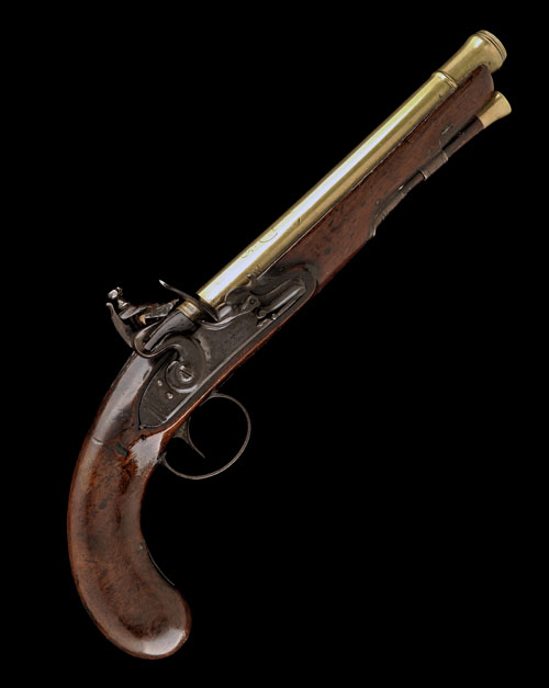 circa 1800, with round tapering cannon-muzzled 8in. brass barrel, traces of open scroll engraving and signed 'WILSON LONDON' at breech, makers mark and London proofs, engraved iron top-tang, slightly curved bevel edged step-tail iron lockplate signed 'DUNDERDALE & WILSON', roller-bearing to the frizzen-spring, walnut full-stock with smooth bag-shaped butt, iron trigger-guard bow and pineapple finial, iron side-nail cups and ramrod thimbles, brass mounted mahogany ramrod (barrel heavily polished with some loss to detail)