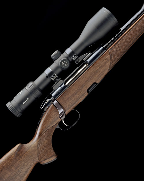 20in. fluted nitro barrel with block-mounted open sights and ramp-mounted blade fore-sight, the receiver mounted with a Zeiss Classic Diavari 2,5-10x50 T* telescopic sight in quickly-detachable mounts, blued finish, the receiver gold-inlaid in script with the model designation, roller safety, detachable magazine, set trigger, figured full-length pistolgrip stock with sculpted cheekpiece, hogsback comb, sling swivels, 14 1/2in. pull including 1/2in. rubber recoil pad