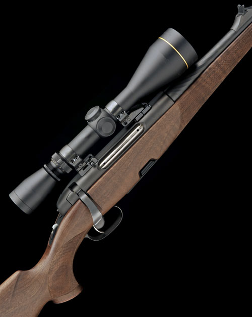 20 1/8in. matt finish fluted nitro barrel with block-mounted open sights and ramp-mounted blade fore-sight, matt finish receiver mounted with a Leupold VX-II 3-9x50mm telescopic sight in quickly-detachable mounts, roller safety, detachable magazine, set trigger, figured pistolgrip-stock with sculpted cheekpiece, hogsback comb, sling swivels, dark wood fore-end finial, 14 3/8in. pull including 1/2in. rubber recoil pad