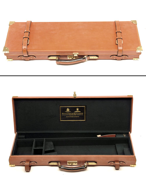 fitted for 27 3/4in. barrels, the interior lined with green baize, brass lock (including key), the lid interior with a leather gold tooled 'HOLLAND & HOLLAND LTD.' trade label