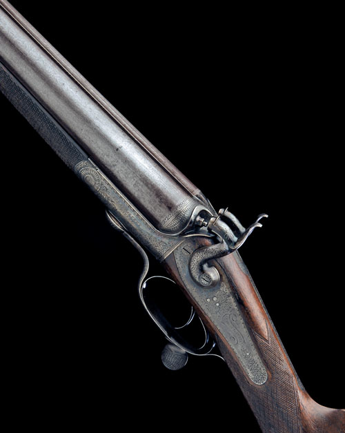 33in. black powder only bold damascus barrels, broad rib engraved 'CHARLES BOSWELL. MAKER. 126 STRAND. LONDON. W.C.', action incorporating A. Lancaster patent underlever operated extractor system, patent no. 1525 of 3rd June 1865, carved percussion fences with fine filiciform engraving, rebounding back-action locks with dolphin hammers, border and acanthus scroll engraving, the lockplates signed 'CHARLES BOSWELL' in a scrolling banner, the action with 'A. LANCASTER'S PATENT', retaining some original colour-hardening and finish, 14 3/8in. replacement stock including 1in. rubber recoil pad, weight 9lb. 13oz.