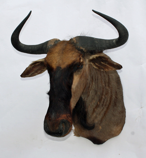 A CAPE & HEAD-MOUNT OF A BLUE WILDEBEEST, with outside spread approx. 26in., inside spread approx. 22 1/2in., horn approx. 26in., boss approx. 4 1/4in.
