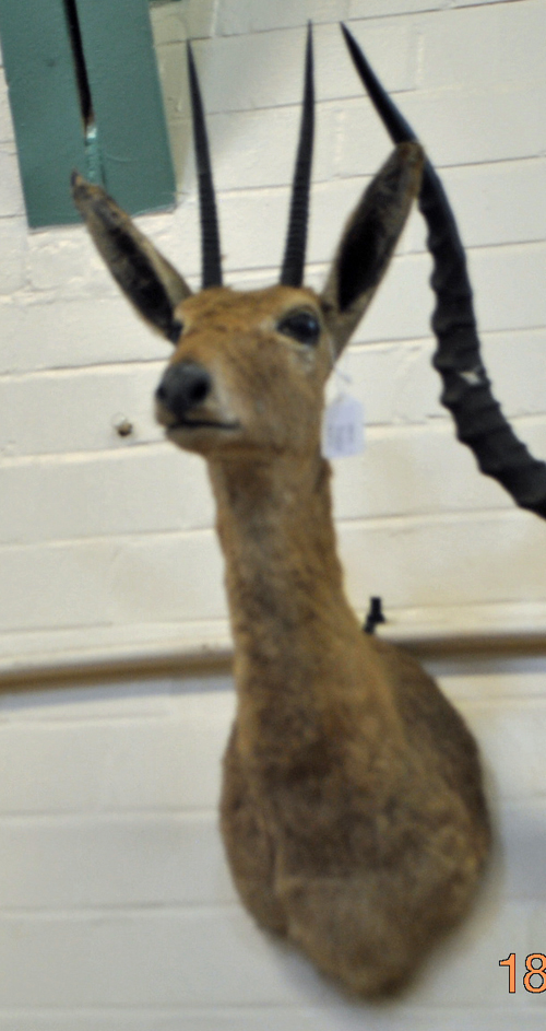 A CAPE & HEAD-MOUNT OF A VAAL REEDBUCK, with horns approx. 7 1/2in., circumference approx. 2 1/4in., tip -tip approx. 3 3/16in.