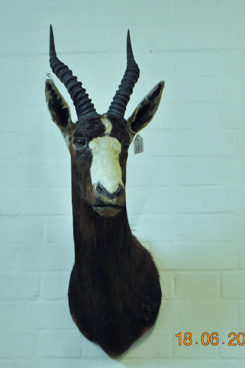 A HEAD & CAPE MOUNT OF A BLESBOK with horns approx. 14in., circumference approx. 5 3/4in., tip-tip approx. 7 1/2in.