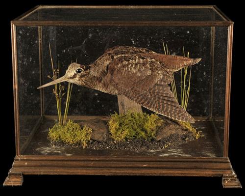 A GLASS CASED FULL MOUNT OF A WOODCOCK IN FLIGHT