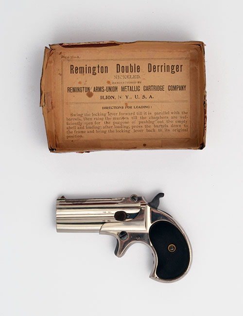 A BOXED .41 (RIMFIRE) DOUBLE-BARRELLED OVER-UNDER NICKEL-PLATED DERRINGER PISTOL, serial no. 100,