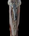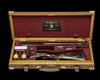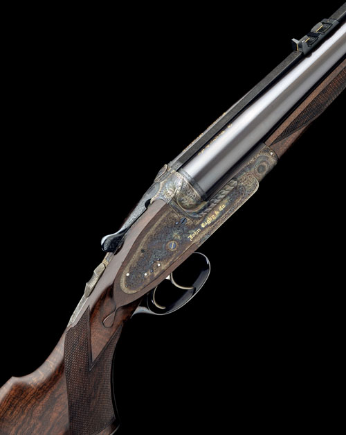 23 7/8in. nitro chopperlump barrels, matt sight rib with open sights and two folding leaf sights marked 75, 150 and 200 and with gold sight lines, ramp-mounted bead fore-sight with flip-up moonsight, protecting hood, tubes inlaid in gold gothic script 'J. RIGBY & CO. LONDON. ENGLAND.' at the breech end and with engraved decorative bands, treble-grip action with relief-engraved leaf fences, carved feathered side bolsters, manual safety with gold-inlaid 'SAFE' detail, gold-inlaid cocking-indicators, rolled-edge triggerguard, action, dipped-edge lockplates and furniture profusely engraved with bold acanthus scrollwork on a matted background, the lockplates gold-inlaid in gothic script 'JOHN RIGBY & CO.', the triggerguard gold-inlaid '.470 NITRO' with a shield outline, the triggerguard tang gold-inlaid with the serial number, triggerplate signed 'D.J. TALLETT', retaining virtually full original colour-hardening and finish, colour-hardened triggers, 14 7/8in. well-figured pistolgrip stock with sculpted cheekpiece, sling swivels, engraved and colour-hardened pistolgrip-cap, with trap gold-inlaid with the Rigby trademark, including 5/8in. leather covered recoil pad, weight 10lb. 13oz., in its brass-cornered oak and leather case with full complement of accessories and an alloy flight case fitted to accommodate the oak and leather case
