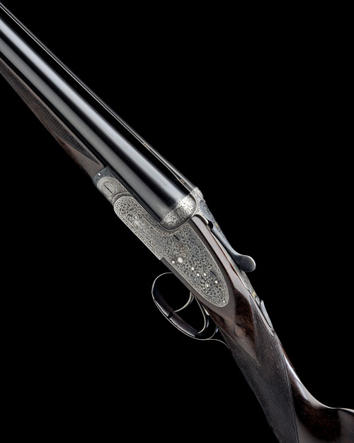 25in. replacement nitro chopperlump barrels (by the makers in 1991), matt Churchill-rib gold-inlaid 'XXV' and '1' at the breech end, tubes engraved 'E.J. CHURCHILL (GUNMAKERS) LTD. ORANGE ST. GUNWORKS LEICESTER SQUARE LONDON.', 2 1/2in. chambers, bored approx. imp. cyl. and 1/2 choke, treble-grip action with hidden third bite, toplever gold-inlaid '1', automatic safety with gold-inlaid 'SAFE' detail, profusely engraved with bold acanthus scrollwork on a matted background, the underside gold-inlaid with an Imperial crown, retaining traces of original colour-hardening and finish, 14 1/4in. figured stock including 7/8in. leather covered recoil pad, weight 6lb. 7oz., in a Churchill lightweight leather double guncase