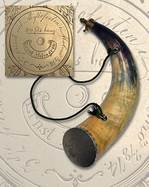 dated for 1874, constructed of natural cows horn, adjustable brass nozzle (traces of plating), large white-metal end-cap with indented turned down engraved edge, the centre engraved with a garland surmounted by a hunters horn above crossed percussion rifles, a central circle engraved with a Swedish inscription which translates as '3RD PRIZE AT THE SHOOTING COMPETITION 2-8-74 at 800 FEET RANGE' together with the name 'ERNST HOLMGREN' in a banner and two suspension rings to the body