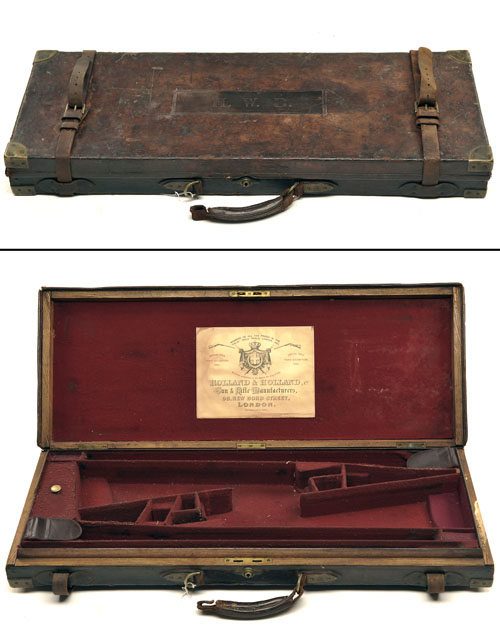 fitted for 28in. barrels (could adapt to 30in.), the interior lined with red baize, central brass push-button lock (key missing), the lid interior with a 'HOLLAND & HOLLAND LTD.' trade label, the lid exterior with the monogram 'H.W.B.', handle needs attention