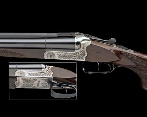 23 5/8in. nitro barrels with raised matt rib, open sights and two folding leaf sights marked 50 and 75, ramped bead moonsight, scroll-back treble-grip action with side-bolsters, automatic safety, removable striker discs, articulated front trigger, arabesque scroll engraving, bright and blued finish, 14 1/2in. pistolgrip stock with cheekpiece, pistolgrip-cap, sling swivels and including 7/8in. rubber recoil pad, weight 10lb. 15oz., in a universal case