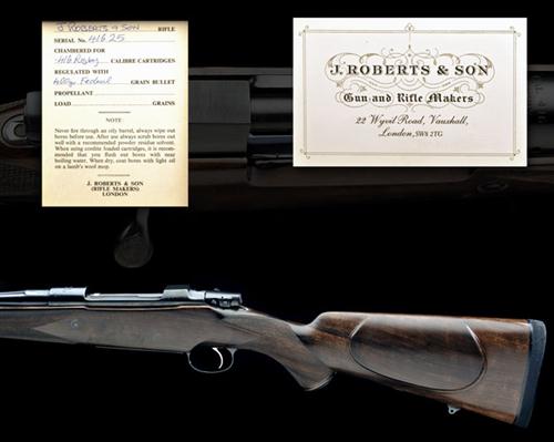 24 3/8in. nitro barrel, engraved in gothic script 'J. ROBERTS & SON. LONDON.', with block-mounted open sights and two folding leaf sights, finely matted to the face, marked 50, 100 and 150 and with gold-inlaid sight lines, ramp-mounted bead fore-sight with flip-up moonsight, receiver ring engraved 'CAL .416 RIGBY', colour-hardened recoil block, hinged straddle floorplate with push button release, triggerguard gold-inlaid with the serial number, figured pistolgrip stock with cheekpiece, colour-hardened steel pistolgrip-cap (with trap), sling eyes, 14 3/4in. pull including 3/4in. rubber recoil pad, in its full length brass-cornered case with accessories