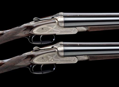 28in. nitro reproved barrels, the ribs engraved 'Wm. POWELL & SON, CARRS LANE, BIRMINGHAM. SIR J. WHITWORTH'S FLUID PRESSED STEEL' and gold-inlaid '1' and '2' at the breech ends (No.1 wall thicknesses below recommended minimum), 2 1/2in. chambers, bored approx. imp. cyl. and 1/4 choke (both), treble-grip actions, toplevers gold-inlaid '1' and '2', automatic safeties with gold-inlaid 'SAFE' details, best fine bouquet and scroll engraving, brushed bright and reblued finish, 13 3/4in. figured replacement stocks including buttplates (No.1 with very minor crack and insert at hand), replacement fore-end woods, weight 6lb. (No.1) 6lb. 1oz. (No.2), in their makers brass-cornered oak and leather double guncase with some accessories