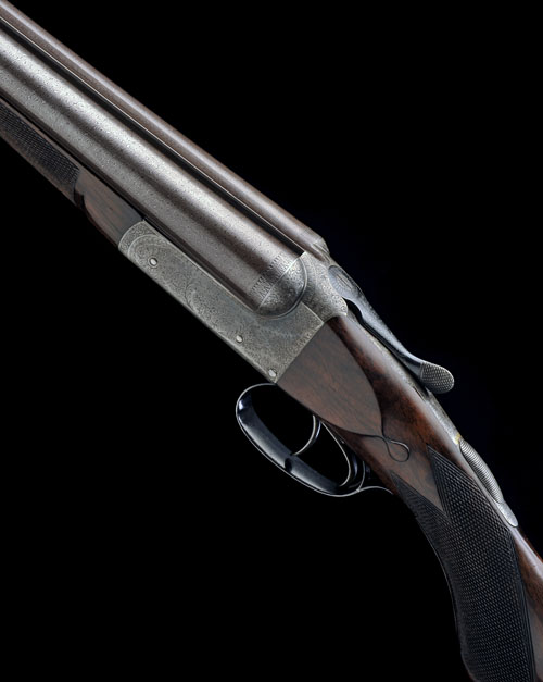 28 1/4in. nitro reproved damascus barrels, rib engraved 'W. RICHARDS. 27. OLD HALL ST. LIVERPOOL.' and with a flash of scroll engraving at the breech end, the tubes engraved with a band of hastate motifs at the breech, 2 1/2in. chambers, bored approx. true cyl. and 1/4 choke, treble-grip action, automatic safety with gold-inlaid 'SAFE' detail, border and acanthus scroll engraving, retaining traces of original colour-hardening and finish, 14 3/4in. figured semi-pistolgrip stock including 5/8in. rubber recoil pad, bolstered fore-end, weight 6lb., in its brass-cornered leather case