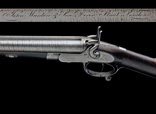 circa 1848, converted from percussion, 29 1/4in. damascus barrels, the rib with a flash of scroll engraving and 'JOHN MANTON & SON. DOVER STREET. LONDON.', rotary underlever, carved percussion fences, non-rebounding locks with dolphin hammers, border and acanthus scroll engraving, the triggerguard engraved with a hound on point, brushed finish, 14in. stock with rectangular escutcheon at the hand, steel buttplate with elongated top strap, in a leather case with Manton label