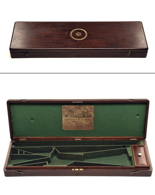 fitted for 28in. small-bore barrels, the interior lined with green baize, central brass lock (key missing), two brass clasps, the lid interior with a 'WILLIAM LING' (repro) label, the lid exterior with a brass flush fitting handle