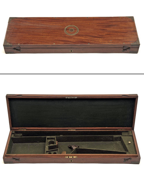 re-fitted and re-lined for 29in. breech loading barrel, the interior lined with green baize, central brass lock (key missing), two brass clasps, the lid exterior with a brass flush fitting handle