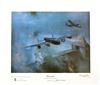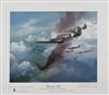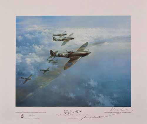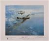 all approx. 22in. x 20in. overall and depicting the two major British fighter and bomber types of the last war, illustrated here by Wing Commander Stanford Tuck's Hawker Hurricane, Group Captain Sir Douglas Bader's Supermarine Spitfire together with one of the unsung heroines of the war, Handley Page's Halifax and lastly one of 617 Squadron's Avro Lancasters, all mounted in brushed aluminium frames with the first two signed by the pilots and the second pair by Marshal of the R.A.F. Sir Arthur Harris and Sir Barnes Wallis respectively, with their certificates of authenticity