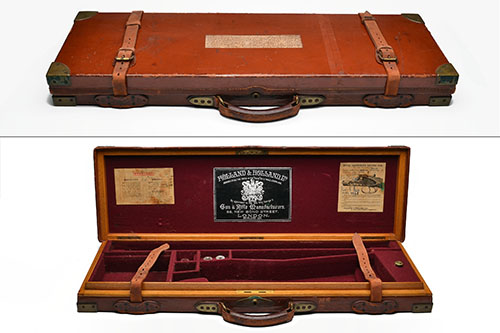 fitted 28in. barrels, the interior lined with maroon baize, central brass lock (including missing), the lid interior with silver-tooled leather 'HOLLAND & HOLLAND LTD.' trade label, the lid exterior with monogram cut-out, including nickel-plated 'HOLLAND & HOLLAND' oil bottle, nickel-plated 12-bore snap-cap, two piece cleaning rod