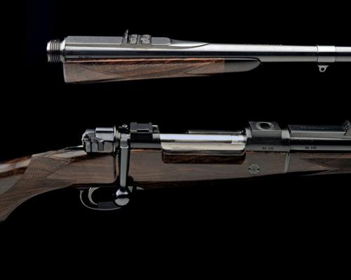 mauser magnum action with quickly-detachable mount bases, thumb cutout, recoil block with flowerhead engraving, floorplate with military style release, figured pistolgrip stock with cheekpiece, engraved steel pistolgrip-cap with gold monogram, sling eyes, 14 5/8in. pull including 7/8in. leather covered recoil pad