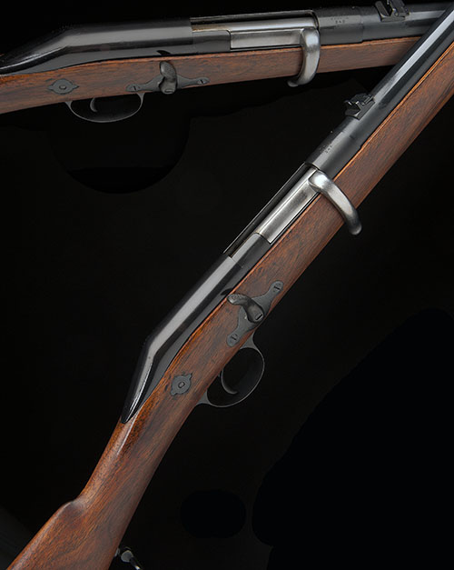 with 19in. reblued barrel sighted to 300 yards and rifled with five grooves, reblued receiver stamped 'CARTER & EDWARDS, PATENT, LONDON 245' together with a fist grasping three crossed arrows, turned down bolt-handle, smooth hammer-cover, auxilliary cocking-decocking lever mounted to the right hand side behind bolt-handle, walnut three-quarter stock, reblued iron furniture, iron sling mounts, iron cleaning rod, refinished throughout, Birmingham proof marks.