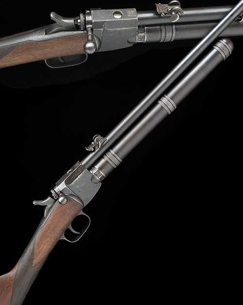 circa 1890, with 25 1/4in. round barrel signed 'MANUFACTURE FRANCAISE D'ARMES ET CYCLES DE SAINT-ETIENNE', bead fore-sight, dove-tailed elevating rear-sight, pre-charged cylinder beneath the barrel with knurled decoration numbered '50634', action engraved with foliage and scrollwork, rotating tap (ball from handle, walnut straight-hand butt-stock with chequered grip (toe repaired), horn heel-plate, engraved iron trigger-guard and adjustable trigger, the whole retaining traces of original finish with some mild bruising throughout