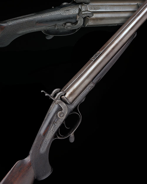 for 1863, with re-finished 26in. damascus barrels, broad flat top-rib with dove-tailed bead fore-sight and standing notch rear-sight with three additional folding leaves, scroll engraving to the rib-end at breech, border and scroll engraved round-bodied action with swing under-lever, border and scroll engraved back-action locks signed 'WILKINSON & SON', scroll engraved hammers with bolted safeties, fully scroll engraved long top-tang with ball end, walnut chequered full pistol-grip butt-stock, engraved iron grip-cap, raised tear-drop cheek-piece, iron heel-plate, chequered walnut splinter fore-end with swing catch marked 'WILKINSON'S LEVER FORE END REGISTERED 13th SEPTr 1860' and eyelets for sling