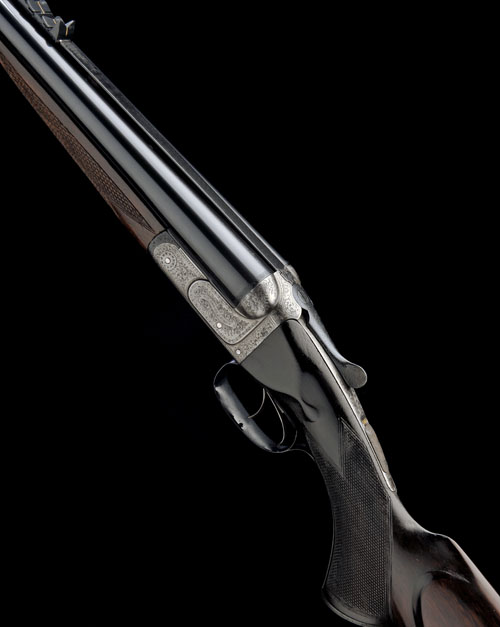 28in. nitro chopperlump barrels, file cut sight rib (dovetailed from sights removed) and with possibly later open sights and two folding leaf sights, marked 50, 100 and 150 yards with gold-inlaid sight lines, ramp-mounted bead fore-sight, left tube re-engraved 'WM. MOORE & GREY 8 CRAVEN STREET. LONDON.', treble-grip action with broad side bolsters, automatic safety with gold-inlaid 'SAFE' detail, beaded border and bold acanthus scroll engraving, the makers name in scrolling banners, brushed and reblued finish overall, 14 5/8in. pistolgrip stock with cheekpiece, engraved steel pistolgrip-cap, sling eye and including 7/8in. rubber recoil pad, replacement fore-end wood with painted finial, weight 10lb. 9oz., in a re-lined leather bound case of Westley Richards type, the case outer marked 'Sir Henry Fletcher Bart. No.2'