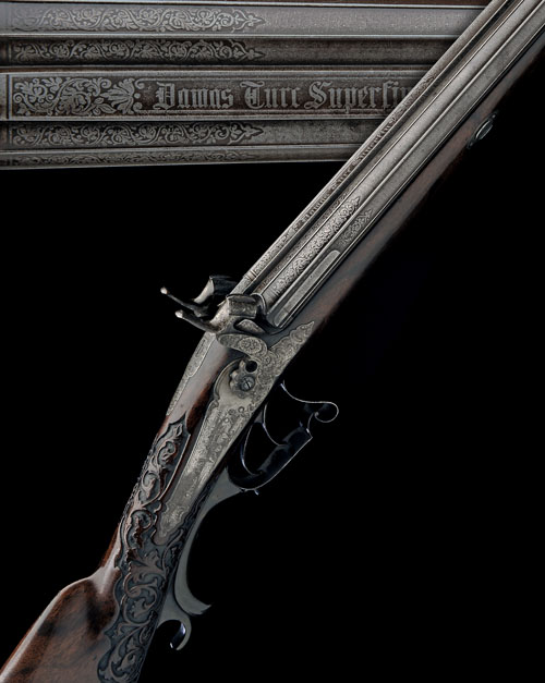 Continental, circa 1855, with best quality fully fluted fine-twist 30in. damascus barrels, the top-rib marked in relief engraving 'DAMAS TURC SUPERFIN' surrounded by fine scroll engraving continued onto the breech-ends, bead fore-sight, scroll engraved top-tang, rococco bordered back-action locks engraved with feathered scrolls and game scenes of hunting dogs, carved hammers engraved with scrolls, highly figured walnut half-stock carved with acanthus leaves at the wrist, raised tear-drop cheek-piece, iron furniture, the heel-plate top-spur engraved en-suite with the locks, horn cover to the trigger-guard tang, scrolled trigger-guard bow, smooth fore-end and wooden under-barrel ramrod with fluted thimbles