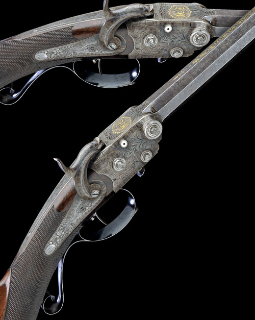 Belgian, circa 1840, with 29 1/4in. browned twist sighted barrel rifled with seven grooves and with silver and gold-inlaid signature 'A.M. LESOINNE & PIRLOT FILS A LIEGE', colour-hardened breech engraved with a sunburst and foliage and with gold-inlaid initials 'FH', the barrel pivoting at the breech on a hinge-pin with exposed trunnions, colour-hardened action engraved with foliage and a bold running border with a further five exposed trunnions and two pierced platinum-lined vents, adjustable rear-sight, the underside with barrel-release catch, colour-hardened detented back-action lock decorated en suite, burr-walnut stock with raised shaped cheek-piece and chequered double-grip, single-set trigger, blued butt-plate and scrolled trigger-guard engraved en suite with the action, iron sling eyes, the whole in fine order and retaining much original finish throughout.