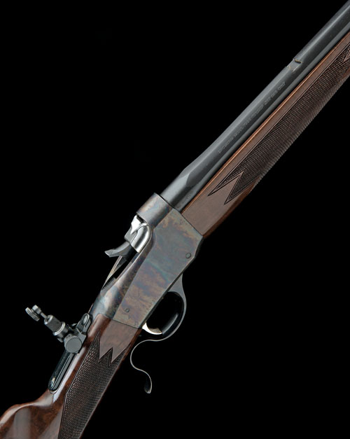24in. nitro barrel with bead fore-sight, rear-sight removed, colour-hardened receiver, fitted with a flip-up peep-sight at the hand, schnabel fore-end, 13 1/2in. figured stock with blued crescentic steel buttplate, in its makers carton