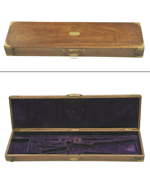 fitted for 31in. barrels, the interior lined with purple velvet, fitted for cleaning and re-loading tools, central brass lock (key missing), two brass clasps, the lid exterior with a central brass escutcheon