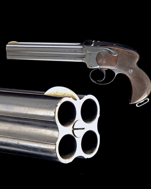 A SCARCE .476 FOUR-BARRELLED OVAL-BORED TRIGGER-COCKING HOWDAH-PISTOL, serial no. 8113,