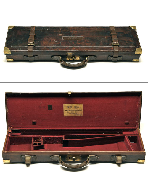 fitted for 28in. barrels, the interior lined with red baize, brass lock key (including key), the lid interior with a 'JAMES MACNAUGHTON & SONS' trade label