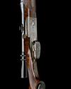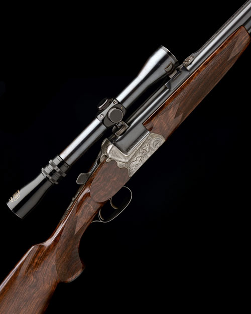 23 13/16in. nitro reproved barrels (in 2014 - partially struck off at muzzles), stepped matt rib with flip-up open sights and ramped bead fore-sight, central banner engraved 'MAURITZ. WIDFORSS HAB STOCKHOLM', the breech end mounted with a Pecar Variable 3-7 telescopic sight in quickly-detachable mounts, 2 3/4in. shot chamber, bored approx. 1/2 choke, scroll-back quadruple-grip action with side-bolsters, removable striker discs, automatic safety, set front trigger, Germanic scroll engraving surrounding woodland game scenes of deer, fox and duck, old silver finish, 14 1/2in. figured pistolgrip stock with sculpted cheekpiece, horn pistolgrip-cap, sling swivels, buttplate, weight 8lb.