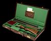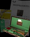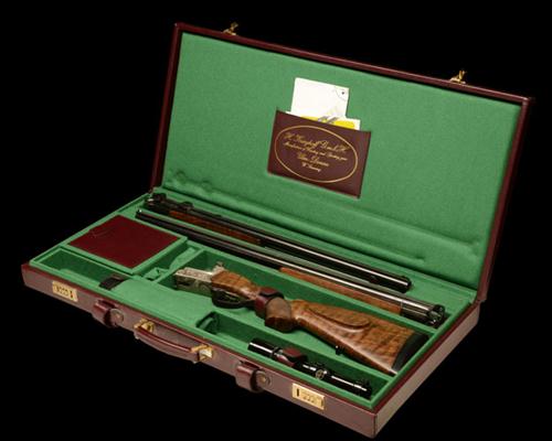 lightweight quadruple-grip alloy action with side-bolsters, hold-open toplever, automatic safety, pin cocking-indicators, set front trigger, synthetic triggerguard, border and scroll engraving, the underside with 'KRIEGHOFF - TECK - D', satin silver and blued finish, 14 7/8in. figured pistolgrip stock with cheekpiece, hogsback comb, sling swivels and including 3/4in. ebonite extension, weight 8lb. 4oz., (combination barrels) and 6lb. 9oz., in its leather case with provision for both sets of barrels, scope, original paperwork and sighting target