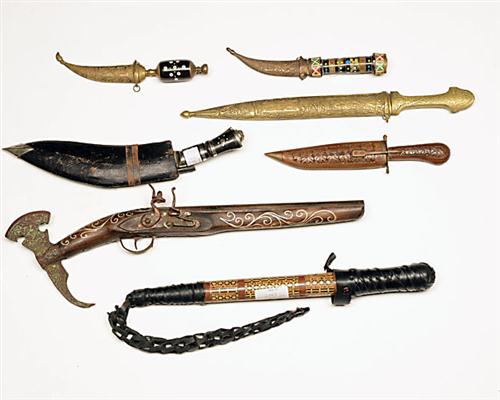 A COLLECTION OF TOURIST ITEMS, first half of the 20th century including a flintlock axe-pistol with inlaid decoration, a brass-mounted kinjal, a kukri knife signed 'INDIA', two small Arabic knives with decorative handles and embossed brass sheaths, an Indian baton with concealed spike and an Indian knife with carved wood sheath