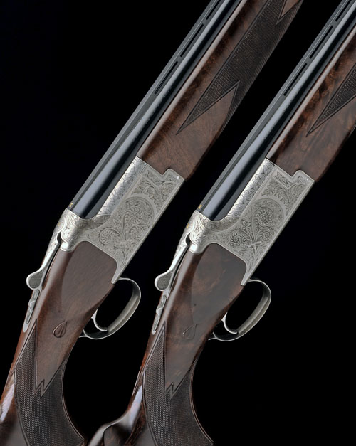 30in. nitro barrels with 7mm ventilated matt top-ribs, gold-inlaid 'I' and 'II' at the breech ends and with intermediate bead sights, 3in. chambers, bored approx. imp. cyl. and 3/4 choke, hold-open toplevers, manual safeties with integral barrel selector switches, bold acanthus scroll engraving with beaded borders, old silver finish, 14 7/8in. highly-figured pistolgrip stocks, weight 7lb. 11oz., in a Browning leather double motor case with original paperwork