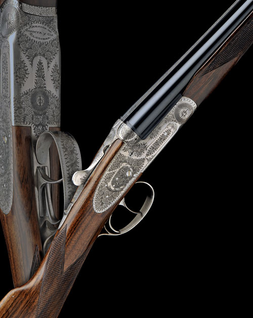 28in. nitro reproved chopperlump barrels with raised matt rib, right tube engraved in script 'Arrieta Special Model No.1 for Victor Chapman. England', 3in. chambers, Teague multichokes (with spares), removable striker discs, automatic safety with gold-inlaid 'SAFE' detail, gold-inlaid cocking-indicators, articulated front trigger, acanthus scroll engraving, the sidelocks with central floral bouquets, bright finish overall, 15in. stock, semi-beavertail fore-end, weight 5lb. 14oz., in its lightweight leather case with canvas and leather outer cover