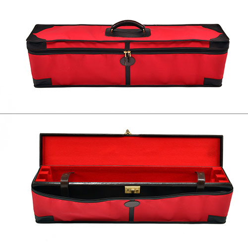 fitted for 32in. barrels, the interior lined with red baize, brass lock (including key), red canvas and leather outer