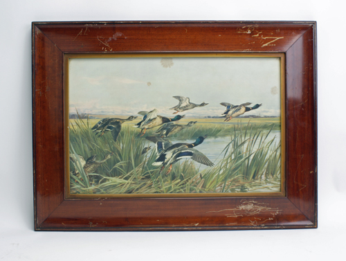 A VINTAGE 'THOMAS BLINKS' COLOURED PHOTOGRAPHIC PRINT OF 'DUCK SHOOTING', showing a flock of ducks taking flight from the waters edge in a summer setting, signed 'Blinks', set in a 3in. gilt wooden frame, some slight surface damage to frame