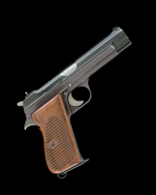 circa 1980, with 4 1/2in. barrel, blued slide and frame, the top of slide marked with a Swiss cross in a shield, horizontally grooved walnut grips and heel magazine release, TOGETHER WITH a .22 conversion kit with relevant magazine