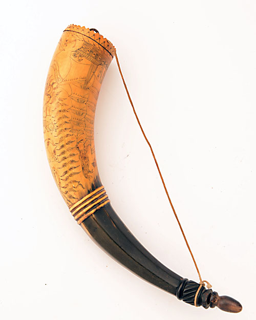 A SCRIMSHAW-DECORATED POWDER-HORN, approximately 14in. overall, the front of horn with faceted sides, carved bands at the intersection, the top of horn scrimshawed with rigging ships, a Royal Crest and other nautical icons, indented edge (some losses) and wooden end-plug, the horn 19th century, the decoration undoubtedly later
