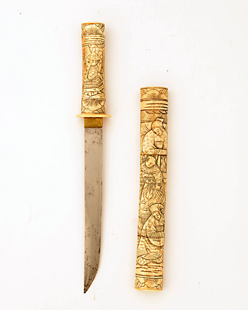 A BONE-MOUNTED DAGGER, almost certainly Burmese and for the tourist market, with 7 3/4in. 'tanto' style blade, the bone scabbard and hilt carved with far-eastern figures and scenes