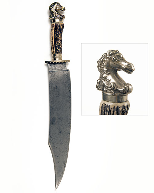 A LARGE BOWIE-KNIFE SIGNED 'COE, SHEFFIELD', circa 1865, with broad curving 14in. clip-point blade with false-edge for the last 5 3/4in. (cleaned, some mild staining and shallow pitting), the ricasso stamped 'SHEFFIELD' and 'ENGLAND' on the right and 'COE' on the left hand side, nickel boat-shaped cross-guard with scalloped forward edge, nickel ferrule, natural stag-horn grip and nickel 'horse's head' pommel