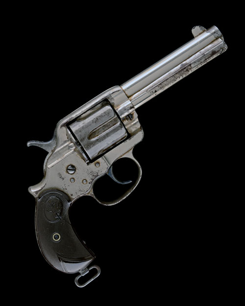 for 1882, with 4 3/4in. barrel, the top signed in two small lines 'COLTS PT FA MFG CO, HARTFORD CT USA', the left side of barrel with etched panel 'COLT FRONTIER SIX SHOOTER', blade fore-sight, sighting groove to the top-strap, solid frame with loading gate, fluted cylinder, chequered hard rubber birdshead grips (one cracked), lanyard ring to heel and under-barrel ejection-rod, the pistol with a fair amount of original nickel-plate