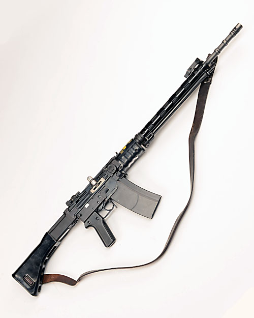 ** A 7.5mm (SWISS) SEMI-AUTOMATIC ASSAULT-RIFLE, MODEL 'SIG STGW 57', serial no. A321548, circa 1970, with 26 1/2in. barrel including flash-hider, folding tunnel-fore-sight, folding adjustable diopter rear-sight, iron ventilated hand-guard, pressed-metal receiver and frame, three-position selector (restricted to semi automatic only), black rubber-coated butt-stock, black plastic pistol-grip, detachable box magazine, black plastic fore-grip and integral folding bi-pod, fitted with a Swiss military leather sling