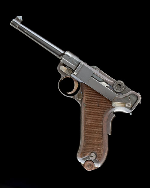 for 1929, with 4 5/8in. sighted barrel, plain receiver, toggle marked 'WAFFENFABRIK BERN' beneath a plain cross, blued frame, grip-safety, chequered walnut grips with smooth borders, wood-based magazine, much original fading finish, TOGETHER WITH a correct pattern leather holster dated 1923 and spare magazine (closure tab stitching undone)