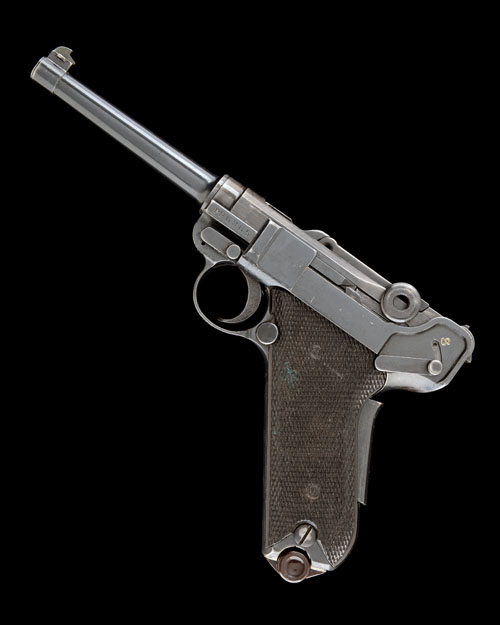 circa 1943, with 4 3/4in. sighted barrel, toggle with Swiss cross mark, grip safety, chequered plastic grips, no provision for shoulder stock, all matching numbers and original magazine with plastic base, the whole retaining a good amount of original finish throughout (faded at high-spots); TOGETHER WITH a Swiss issue leather holster dated for 1918