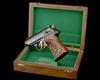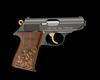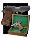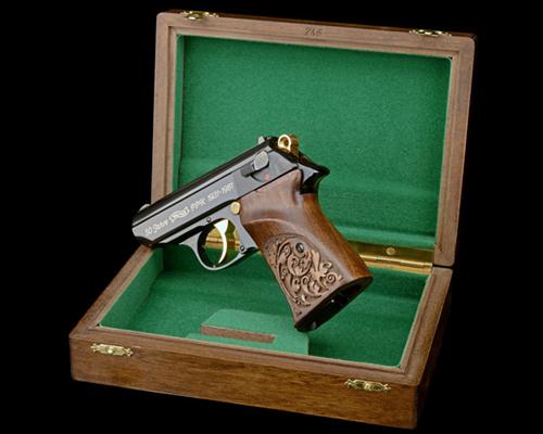 manufactured in 1981, with 3 1/4in. polished barrel, finely blued sighted slide with the serial no. and calibre inlaid in gold on the right hand side and '50 JAHRE WALTHER PPK 1931-1981' inlaid in gold on the left, gilt finish to the ejector claw, trigger blade, magazine release catch and hammer, polished blue finish to the frame, fitted with 'Walther' trademarked walnut grips hand carved with floral scrolls; COMPLETE WITH its manufacturers walnut case, the lid with raised rectangular centre section carved with floral scrolls surrounding the Walther banner, the interior blocked and lined in green flock for the pistol and a spare magazine (included), the whole appearing unused, complete with signed certificate of authenticity and additional manufacturer's plastic carton